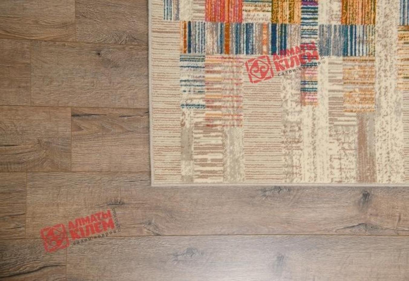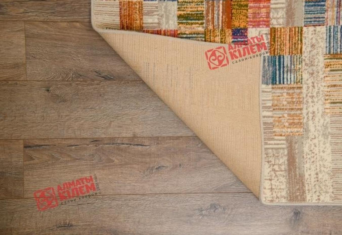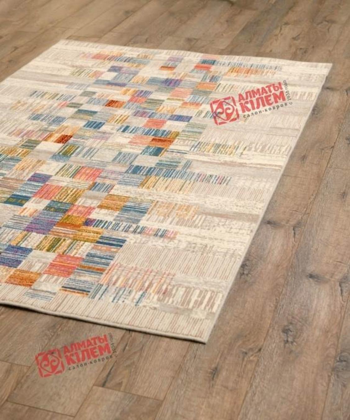 Оригинальный шерстяной ковер, купить который с доставкой в Алматы-Кілем можно не выходя из дома, с геометрическим разноцветным узором создан для ультрасовременных интерьеров. Вертикально расположенные кубики по центру бежевого фона создают трехмерный эффект. Они слегка размыты к краям и плавно переходят в основной светлый оттенок. Полотно одновременно и расширяет комнату благодаря наличию горизонтальных полос, и вытягивает за счет удлиненной формы.