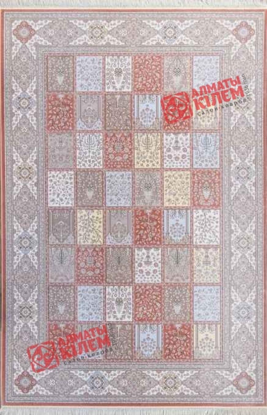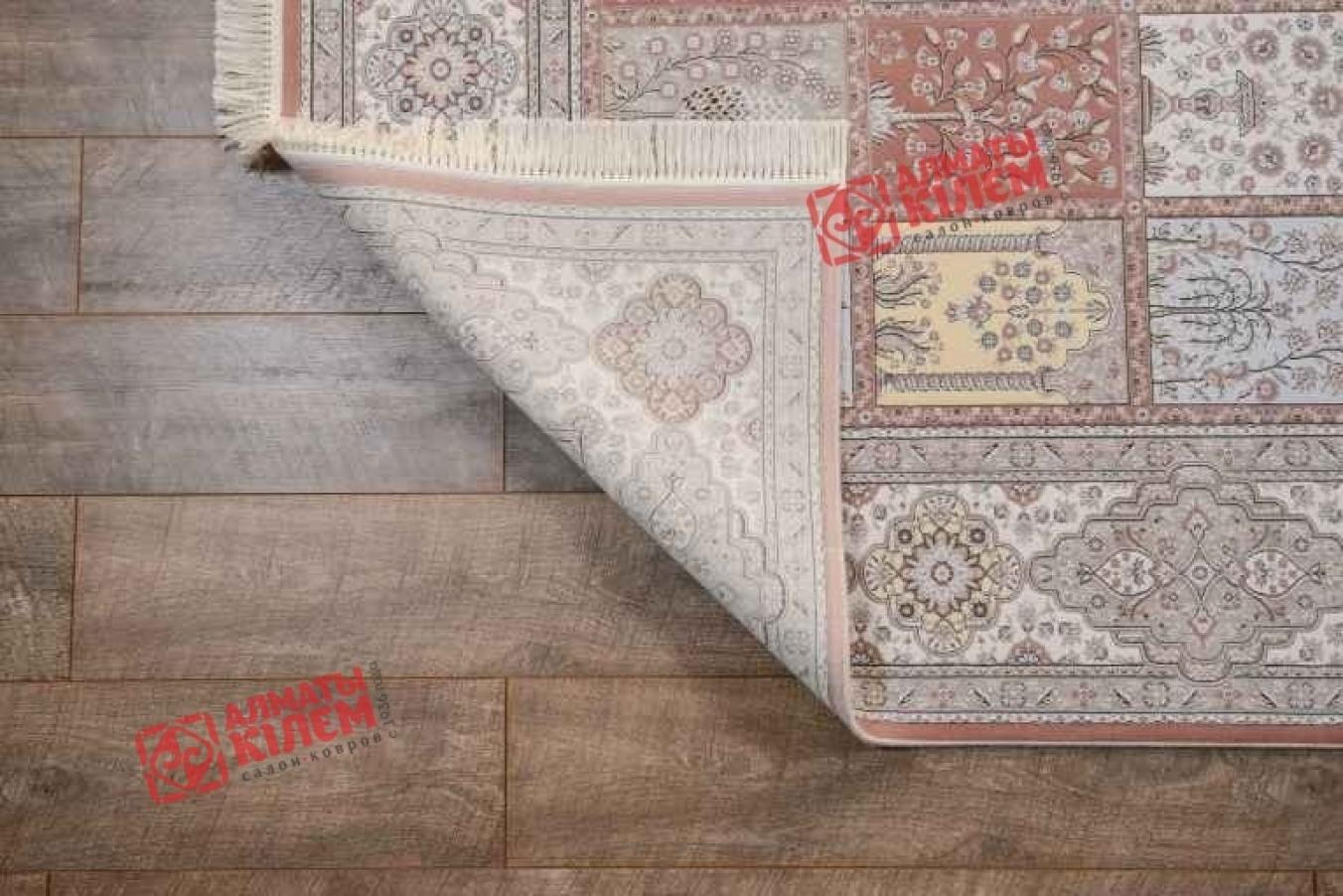 Оригинальный дизайн этого ковра покоряет с первого взгляда. Он сочетает в себе классический стиль и элементы печворка. Сорок восемь фрагментов миниатюрных ковриков с изредка повторяющимся рисунком образуют эффектную композицию. Центральное изображение обрамлено широкой рамкой с геометрическим узором треугольников. Смотрится однотонный ковер просто великолепно. Его фактура напоминает собой шелк, ведь выполнено полотно из натурального бамбука. Оно не только приятно на ощупь, но и поддерживает прекрасный «микроклимат» пола. Ходить по ковру — одно сплошное удовольствие. Модель смотрится невероятно красиво абсолютно в любом классическим и современном интерьере.