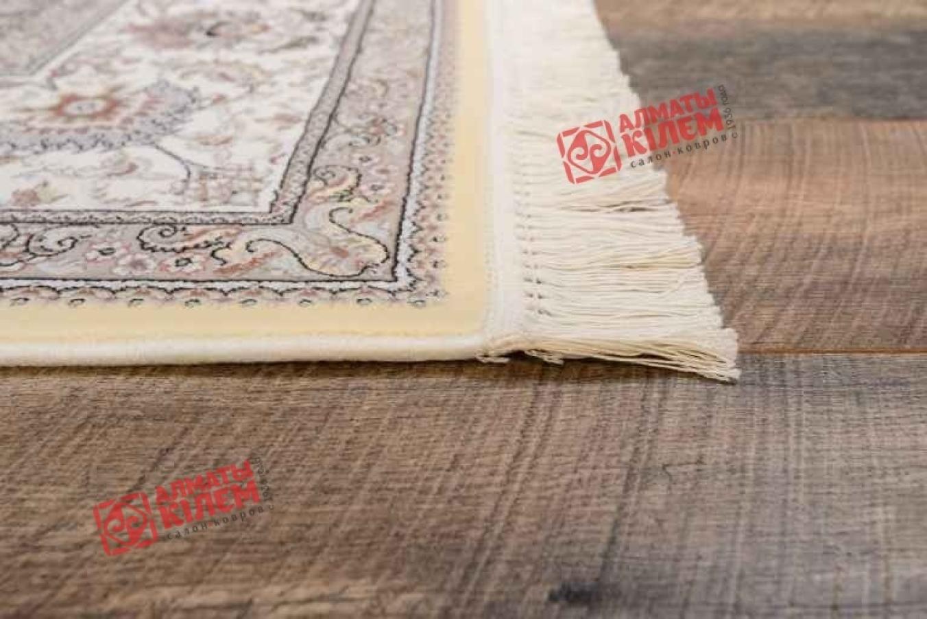 Роскошный ковер из бамбукового «шелка» в классическом стиле украсит собой кабинет или офис респектабельной компании, подчеркнет богатство убранства гостиной, спальни, столовой, прихожей, холла загородного дома или квартиры. Он выглядит по-королевски изысканно. Средний высоты ворс из натурального гипоаллергенного волокна оставляет после себя самые приятные ощущения от соприкосновения. Светлая рамка с флористическим узором обрамляет собой центральный узор. Рисунок роскошных фантазийных цветов на светло-желтом приглушенном фоне перекликается с окантовкой ковра. Классический дизайн однотонного ковра поддерживает густая бахрома сверху и снизу бамбукового покрытия.