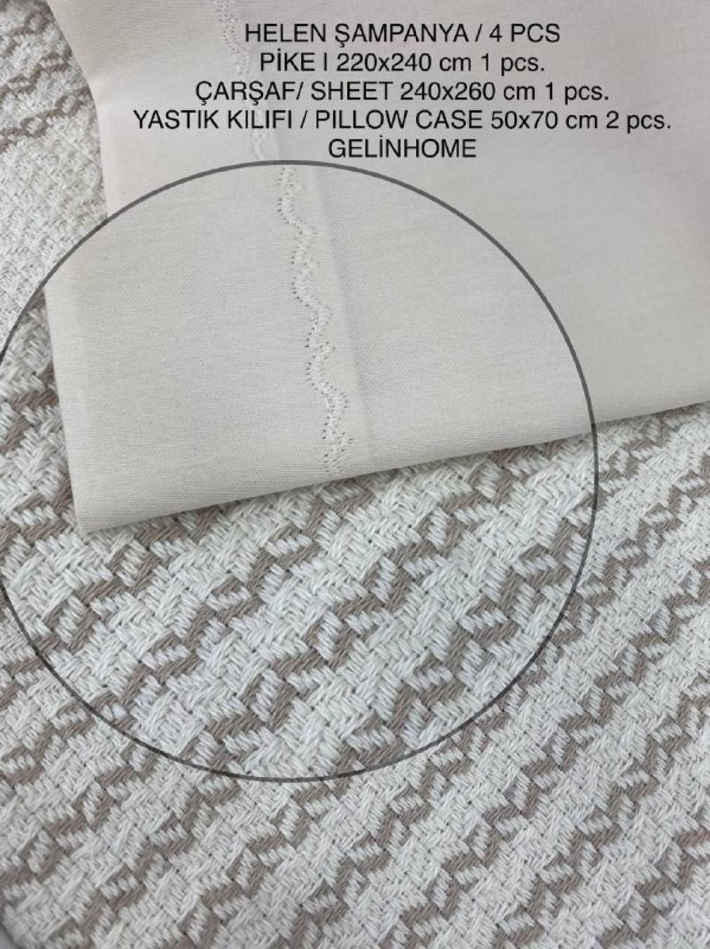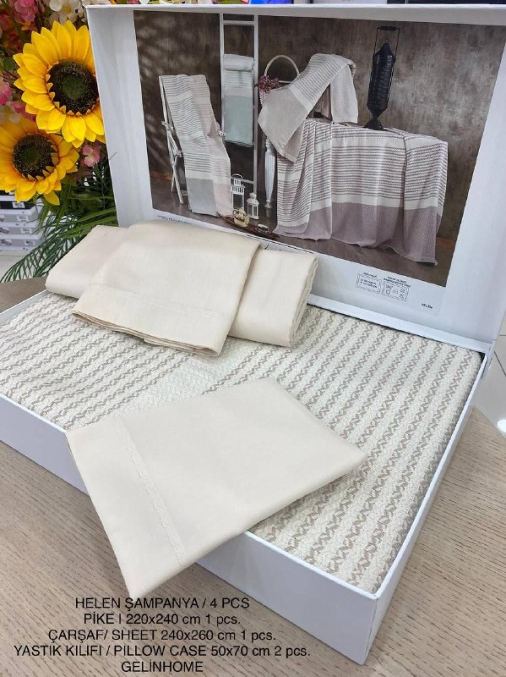 Великолепный набор покрывало, простынь и 2 наволочки от турецкого бренда TAC в цвете шампань с вышивкой по краю. Выполнено изделие из стопроцентного хлопка. Натуральный материал оставляет на коже исключительно приятные тактильные ощущения, легко и просто отстирывается, не накапливает статического электричества. Изделие создает прекрасный ансамбль вместе с комплектом белья из той же коллекции. Продается покрывало с простыней и наволочками в фирменной упаковке, позволяющей преподнести набор в подарок.