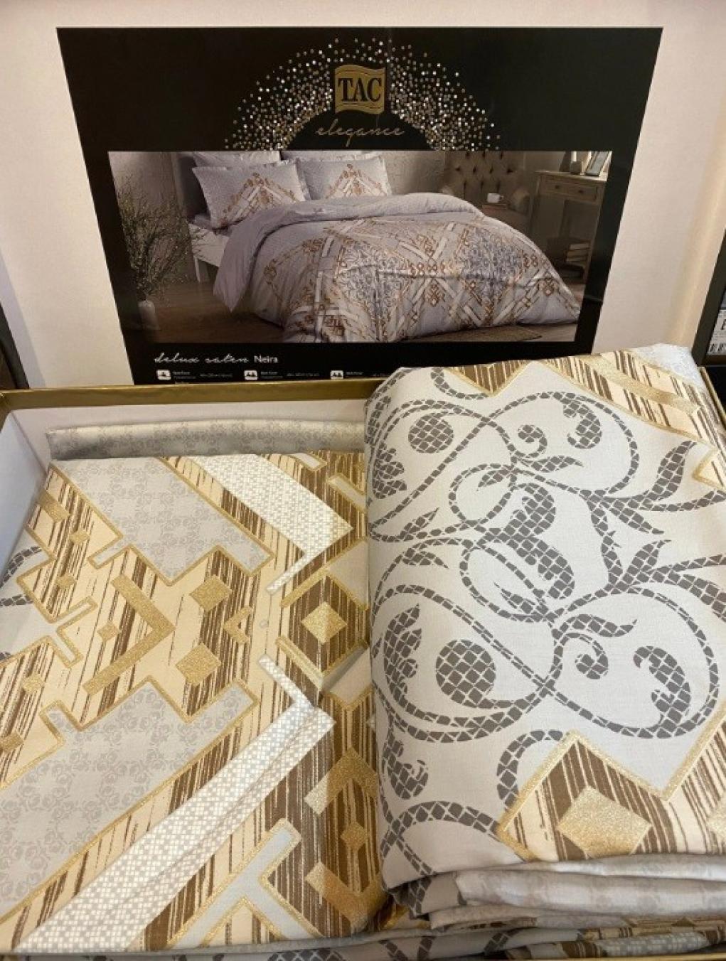 Двуспальный комплект постельного белья в расцветке мультикалор производства Турции от известного бренда TAC. Пошита модель из стопроцентного хлопкового волокна под названием Saten, внешне имитирующего натуральный шелк. Набор выполнен в современном дизайне с геометрическим узором в палитре мультикалор. Особую изюминку ему придают золотистые и серебристые вкрапления. В состав комплекта входит простынь, пододеяльник и две наволочки, а поставляется он в фирменной красивой упаковке.