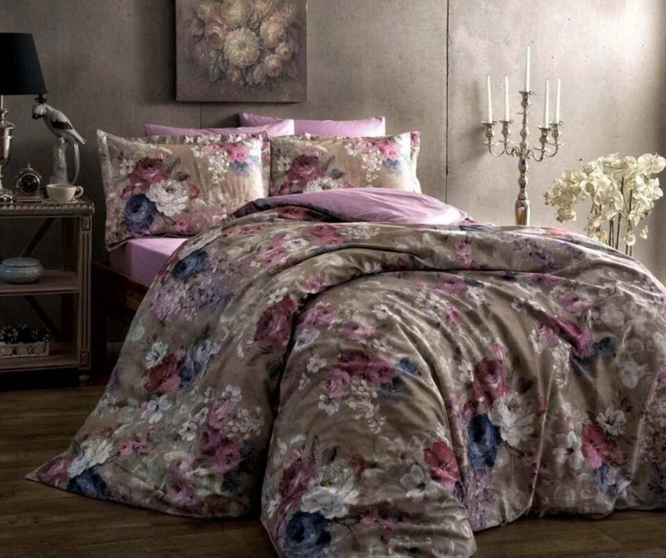 Невероятно роскошный комплект двуспального белья от известного турецкого производителя TAC. Модель выполнена из стопроцентного хлопка Saten, поверхность которого переливается шелковистым блеском, а создаваемые приятные тактильные ощущения способствуют комфортному сну. На серебристо-коричневом фоне словно россыпью драгоценных камней по полотну разбросаны изображения цветов различных оттенков. В комплект входит простынь, пододеяльник и четыре наволочки.
