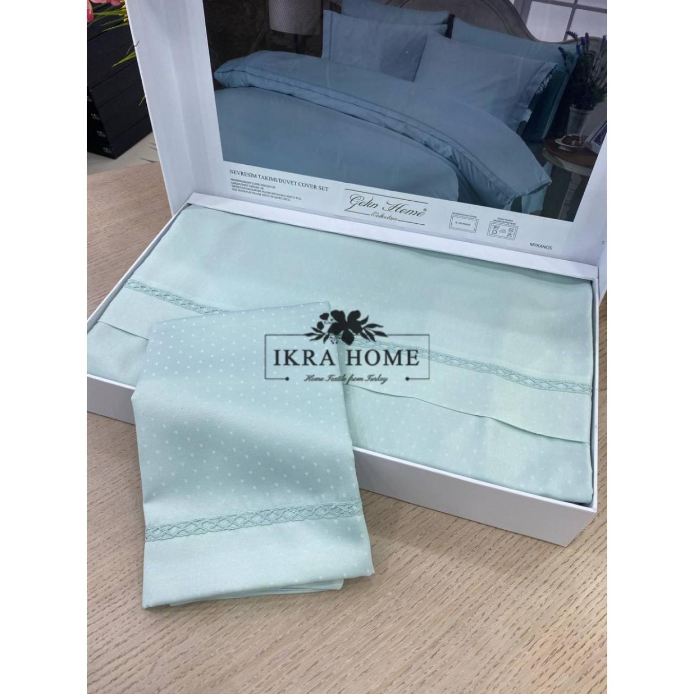 Двуспальный роскошный комплект спального белья от известного турецкого бренда TAC. Набор выполнен из элитного сатина, получаемого путем особого плетения хлопковых нитей, украшен гипюровой вставкой. Материал экологически безопасен, отличается невероятно красивой фактурой и текстурой, оставляет после себя приятные тактильные ощущения, не выгорает и не выцветает, надолго сохраняет привлекательный внешний вид. Состоит комплект ментолового цвета в горошек из четырех наволочек, простыни, пододеяльника.
