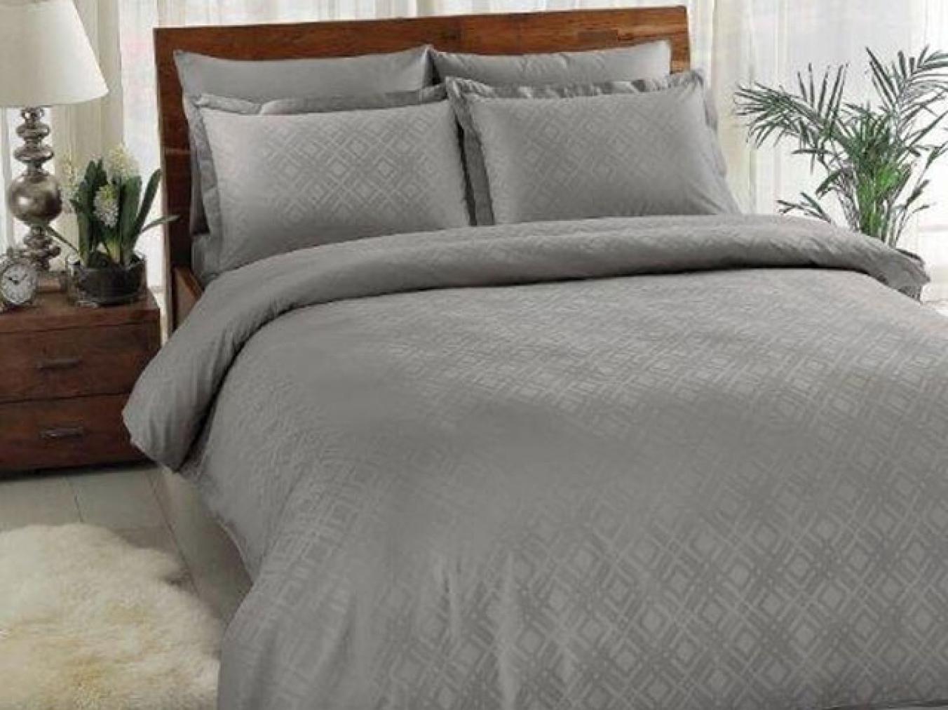 Великолепное постельное белье «VisionSaten» из сатина-жаккард серого благородного цвета. Это самая плотная ткань, получаемая путем плетения на квадратный сантиметр 120-270 нитей. Она абсолютно гладкая (никакого ворса), имеет объемный узор и лишена изнанки. Наружный узор зеркально противоположен с оборотной стороны.