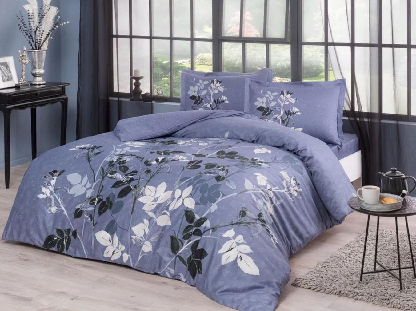 Двуспальный комплект постельного белья насыщенного синего цвета производства Турции, славящейся своим хлопком. Набор выполнен из высококачественного стопроцентного хлопкового волокна разновидности Saten, отличающегося изысканным шелковистым блеском. Материал обладает высокой воздухопроницаемостью, гипоаллергенностью, не выгорает и не выцветает длительное время. Особую изюминку комплекту из простыни, пододеяльника, двух наволочек придает черно-белый флористический узор.