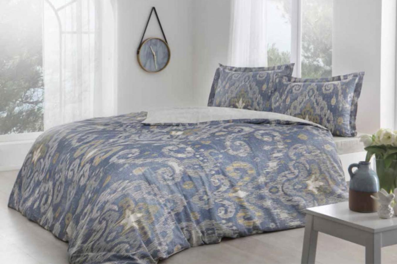 Роскошный двуспальный комплект постельного белья от турецкого бренда TAC сделает сон невероятно комфортным. Пошита модель из стопроцентного хлопкового волокна Saten, обладающего шелковистым блеском, улучшенными эксплуатационными характеристиками. Дышащая ткань прекрасно впитывает и отводит влагу. Летом под ним прохладно, а зимой тепло. Выполнен комплект в синей палитре с изысканным принтом в золотистой палитре. Он состоит из простыни, пододеяльника, четырех наволочек.